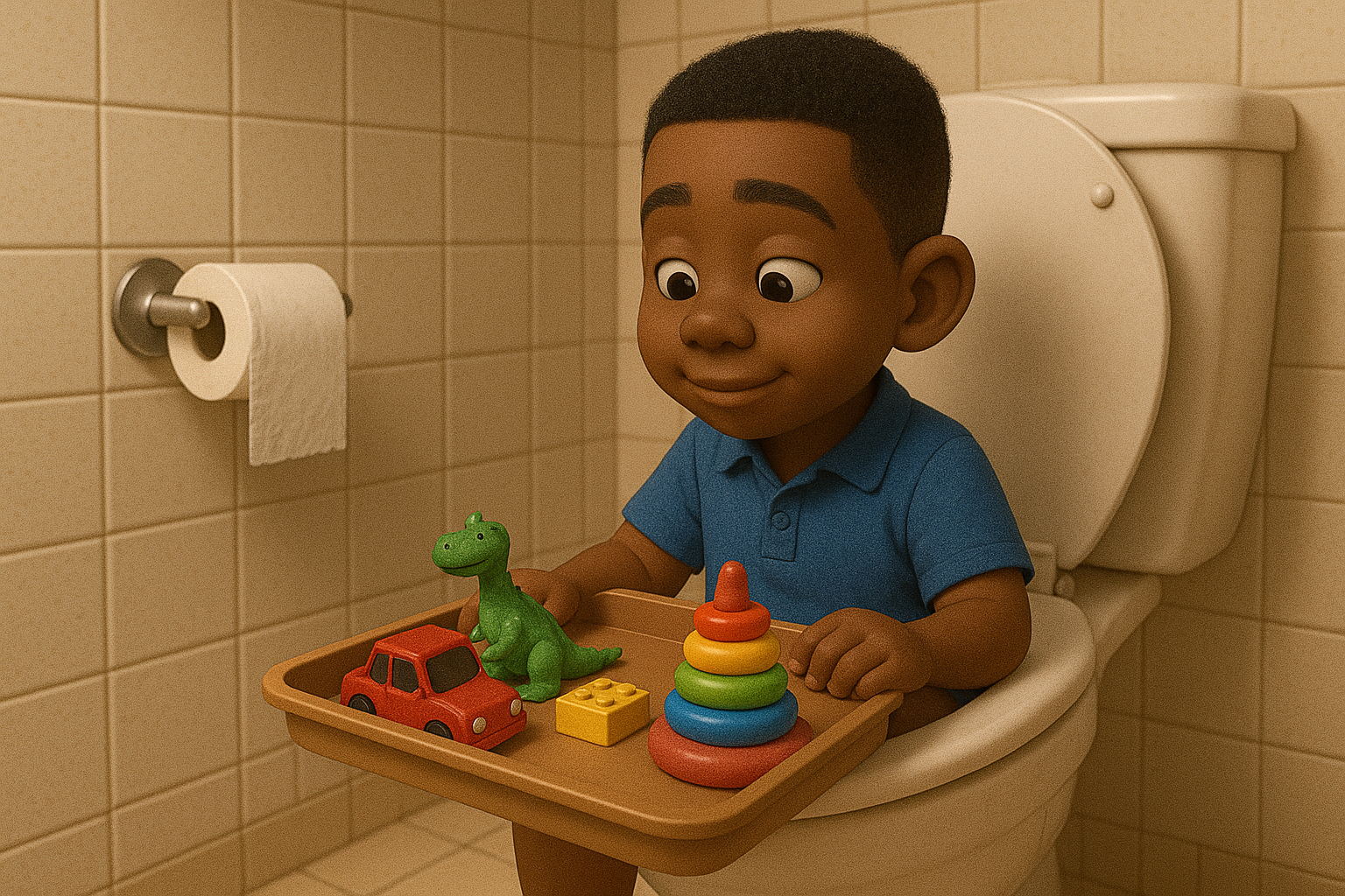 If you struggle with getting your child to sit on the toilet or getting them to remain on the toilet for periods of time, I suggest a special tray that remains in the bathroom just for that time that your child is sitting on the toilet. This tray is for special toys that your child will only have access to while they are in the bathroom on the toilet and no other time. Make sure the toy is something that will hold their interst for a period of time. Electronics are not a good placeholder for this toy, especially if use of electronics is being used as part of your rewards system. However, having a special toy that they can only play with at that time will encourage long placed sitting and make them more agreeable to sit on the toilet in order to play with or use that object. It will also encourage relaxed bowel movements instead of forced because they are more relaxed and not trying to rush the bowel movement to get back to playing.